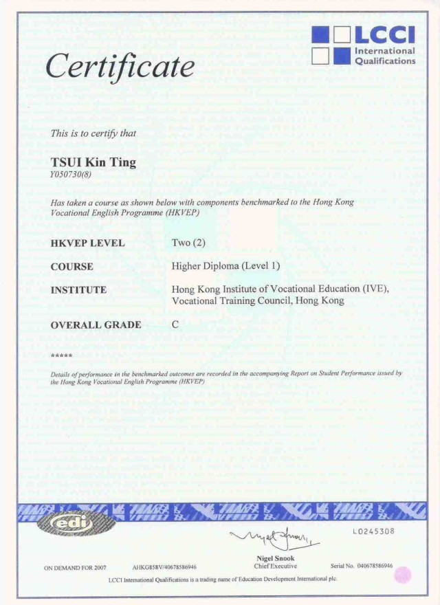 I get this certificate when I was Year 1 of IVE, it is a Hong Kong