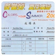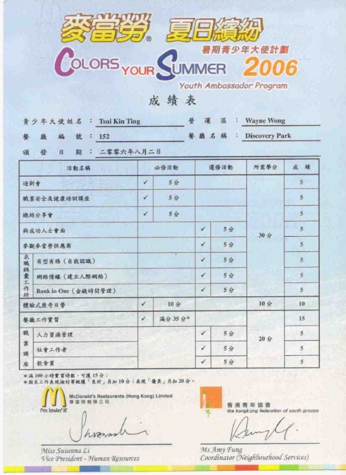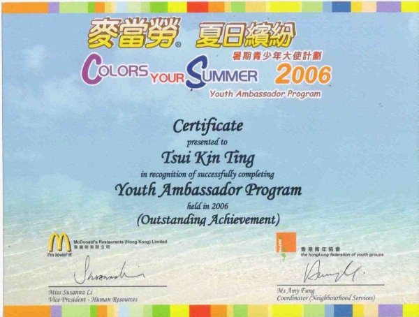 In the 2006 summer, I join a youth ambassador program, it was conducted by McDonald(HK). In the process of this program I had participate restaurant training in McDonald and a lot activities. Finally,